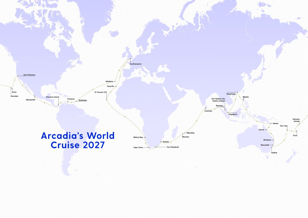 Southampton – Madeira – Bridgetown (Barbados) – Curacao – Panama Canal (Full Transit) – Manzanillo (Mexico) – San Francisco (United States) – Hilo (Hawaii) – Honolulu (Hawaii) – Cross International Date Line – Apia (Samoan Islands) – Suva (Fiji) – Port Vila (Vanuatu) – Sydney (Australia) – Newcastle (Australia) – Brisbane (Australia) – Cairns (Australia) – Alotau (Papua New Guinea) – Manila (Philippines) – Hong Kong – Singapore – Port Kelang (Malaysia) – Penang (Malaysia) – Colombo (Sri Lanka) – Port Louis (Mauritius) – Reunion – Durban (South Africa) – Gqeberha, Port Elizabeth (South Africa) – Cape Town (South Africa) – Walvis Bay (Namibia) – St Vincent (Cape Verde) – Tenerife – Southampton