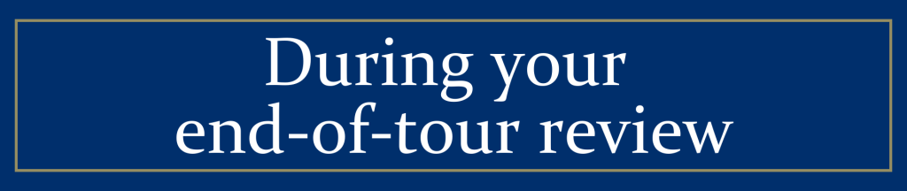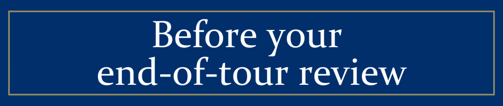 Your end-of-tour review is an important part of the performance cycle. It is a great opportunity to take time and space to reflect on all the incredible things you’ve achieved against your goals. Preparation is important for a great end-of-tour review.