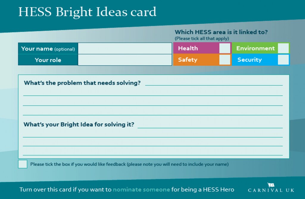 Becoming a sustainable business is everyone’s responsibility so please make sure you share any Bright Ideas on reducing or replacing SUPs on board or in Carnival house through our HESS feedback stations.