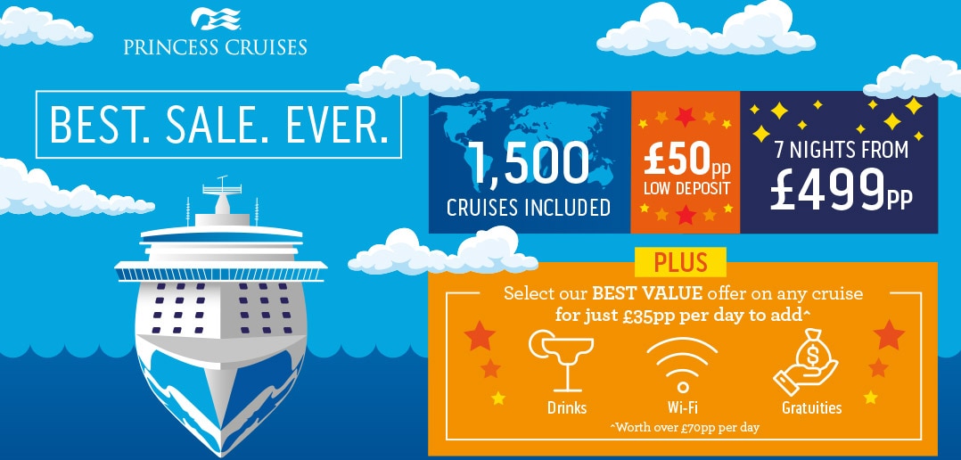 Princess Cruises offers ‘best sale ever’ with voyages from £499 plus low deposit – as well as ‘fantastic’ additional onboard savings package.