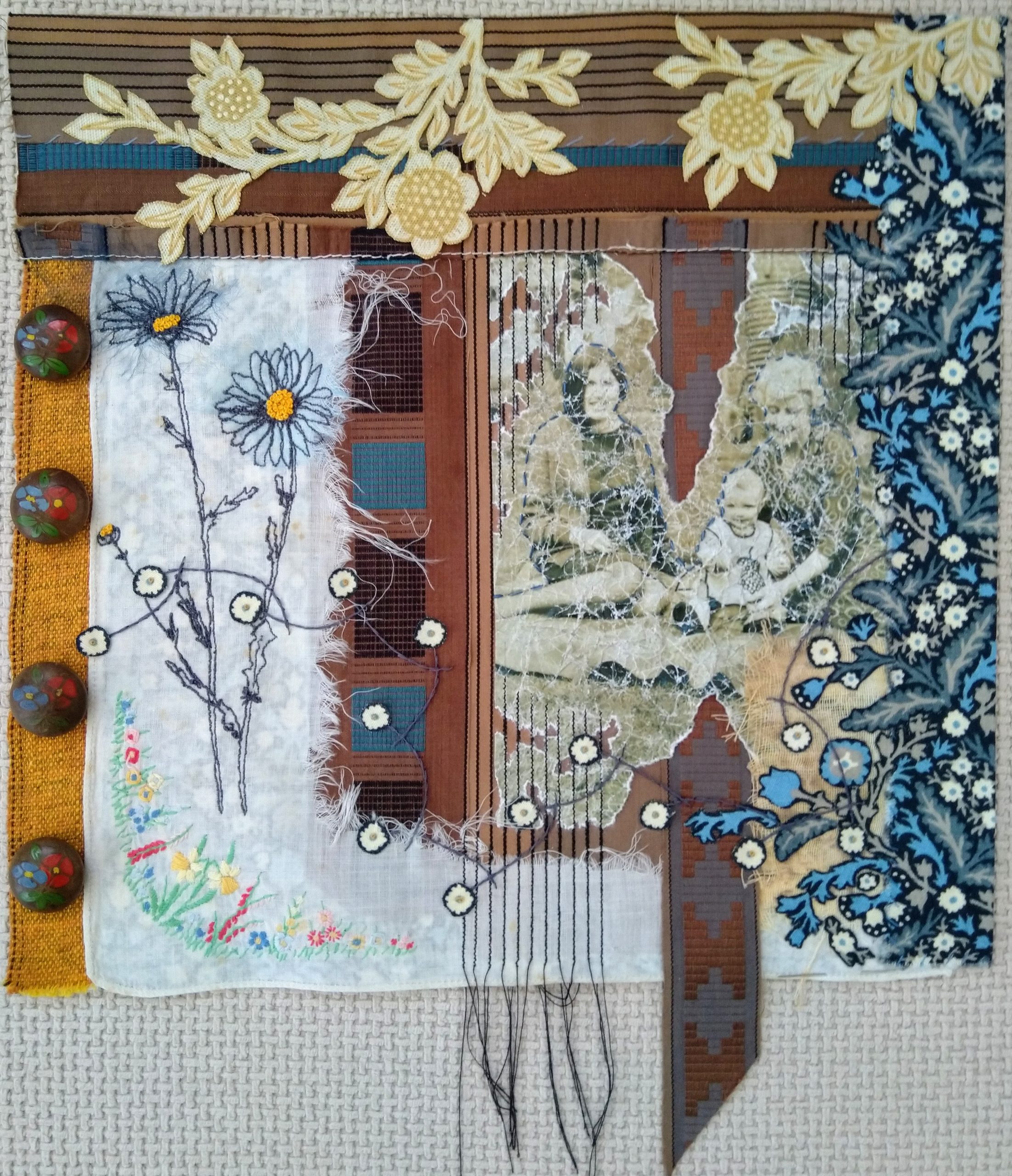 - Jess Richardson has made this creative textile piece called ‘Inheritance’ It is made using fabrics, linens and buttons inherited from her Mom, collaged around a distressed photo showing Jess, her Mom and her Gran.