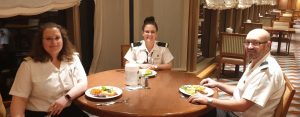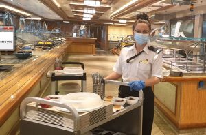 11:00 The Galley team prepares all meals – Laurence, Hotel Auditor and I are preparing the trolleys and trays to deliver the meals to the cabins of colleagues who are currently in standard preventive quarantine following Sign-On.