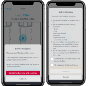 - Check health status of desk bookers by requesting mandatory self certification i.e. Are you fit and well? Yes or No. Are you experiencing any symptoms of Covid-19? Yes or No.