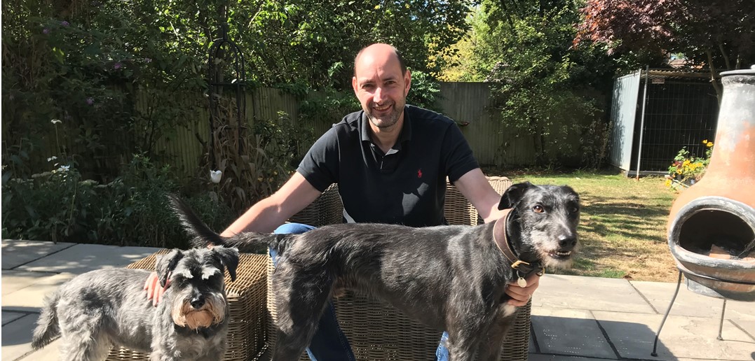 Richard at home with his dogs, Mutley and Wilson