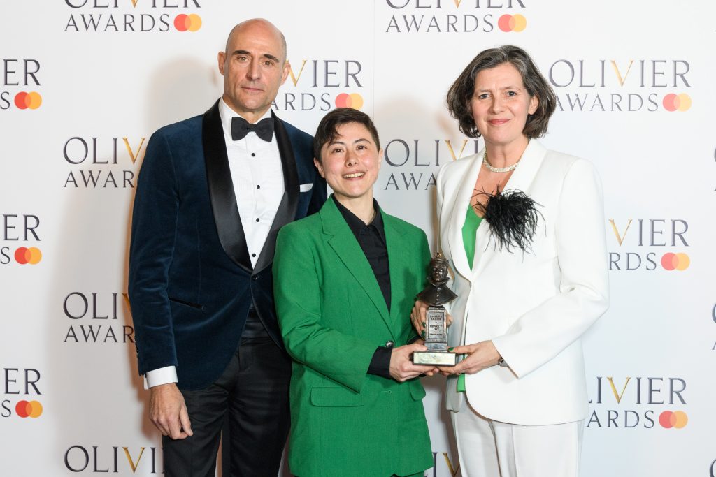 Erica Whyman and Ailin Conant, collecting on behalf of Phelim McDermott, winner of Best Director for RSC’s ‘My Neighbour Totoro’ presented by Mark Strong at The Oliver Awards 2023