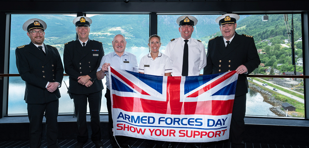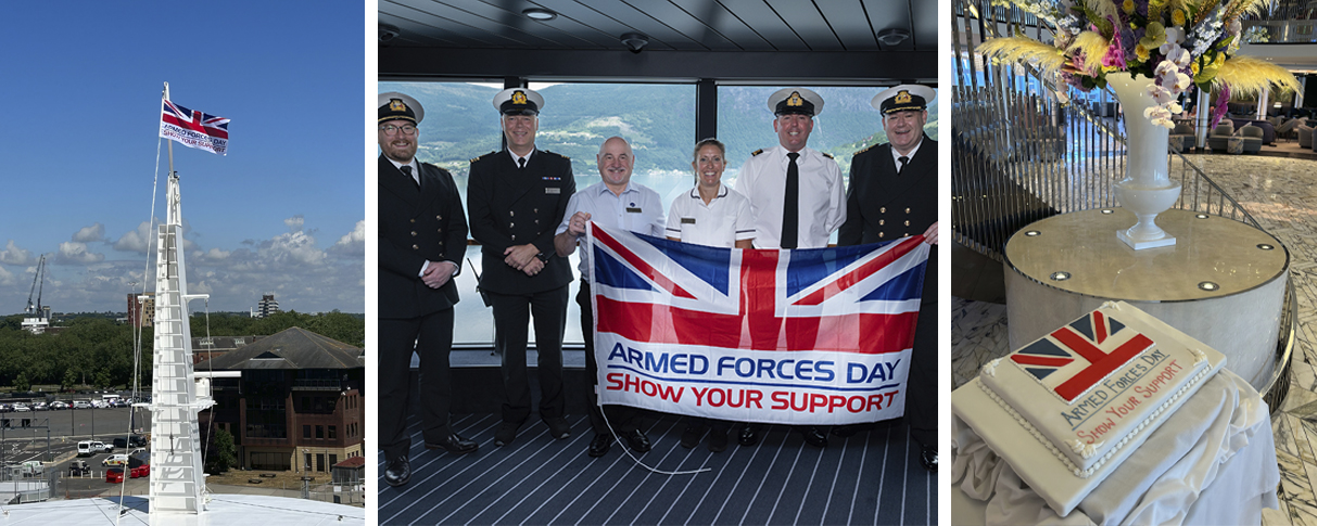 Alongside activities across the fleet, the team on Iona proudly flew the Armed Forces Day flag on Saturday 24 June whilst alongside in Southampton, held a get together on Sunday 25 June, and baked a special cake. The armed forces were represented onboard by: Nursing Officer Sally Webster who is also a Captain in the Army Reserves, Hotel General Manager Gordon Marshall, who is also a Sub Lieutenant in the Royal Navy Reserves, Security Officer Steve Wakeford, a Veteran of the Military Police, and HR Manager Charles Stewart who was a lieutenant in the Territorial Army Reserves.