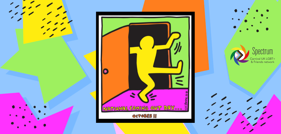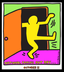 Keith Haring designed the first Coming Out Day logo in 1988. The black inside of the closet and the colours on the outside can be seen to represent the feeling of coming out and being able to live life to the fullest.
