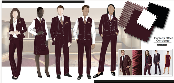 As shown in the mood boards below, the Purser’s Office & Concierge have a day and evening uniform. With colour coordinated accessories, including a tie and a pocket square.
