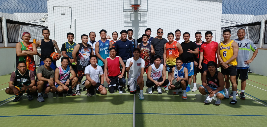At noon, the Queen Mary 2 team gathered and were welcomed onboard Iona to make use of the fantastic sports court that Iona has to offer. Following the initial greetings of crew, meeting old friends and colleagues, it was time to don the sneakers and sports shirts for the first basketball battle between the ships and the brands of 2025.