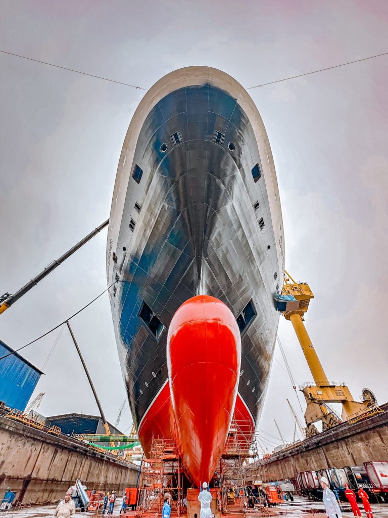 “This is a photo of Queen Elizabeth during her refit in the dry dock. The extensive refurbishment, encompassing everything from revitalized staterooms and refreshed public spaces to the introduction of exciting new dining concepts and entertainment options, is a true representation of the ‘now and wow’ of Cunard.”