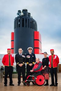 Captain Sharples last year had the privilege to lead the merchant navy representatives at the festival of remembrance held at the Royal Albert Hall. Today he enthusiastically pulled out all the stops to facilitate a very poignant photoshoot under the iconic funnel of the Cunard Queen Victoria, he even proudly and poignantly wearing his grandad’s and father’s medal. Other crew members who had also served in the armed forces leaped at the opportunity to support the event to assist and enable Allen to mark the moment in a special Cunard way.