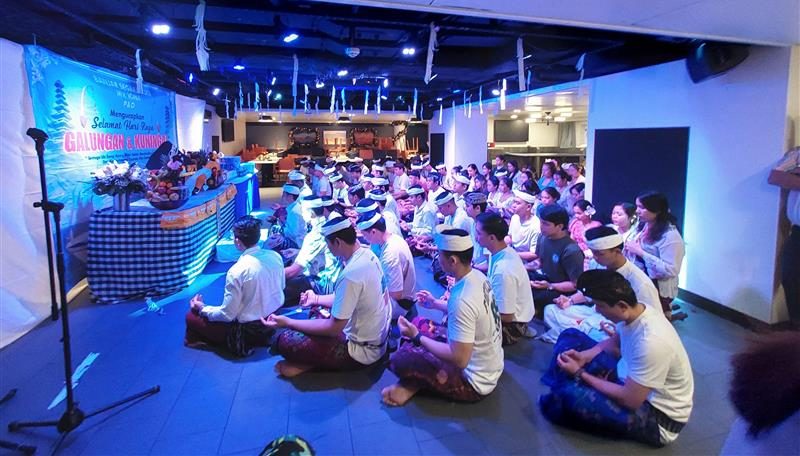 MV Azura hosted a vibrant Galungan celebration for over 100 Balinese Hindu crew members. The event, held from 23:00 to 01:30, was designed to strengthen kinship and cultural unity among the Indonesian team. The evening featured prayers, offerings, and a communal meal of traditional dishes, supported by contributions from various departments – from venue arrangements by HR to delicious meals prepared by the Galley team. The Production Team ensured the atmosphere was complete with music and sound, while the Seafarers Welfare Committee sponsored refreshments.