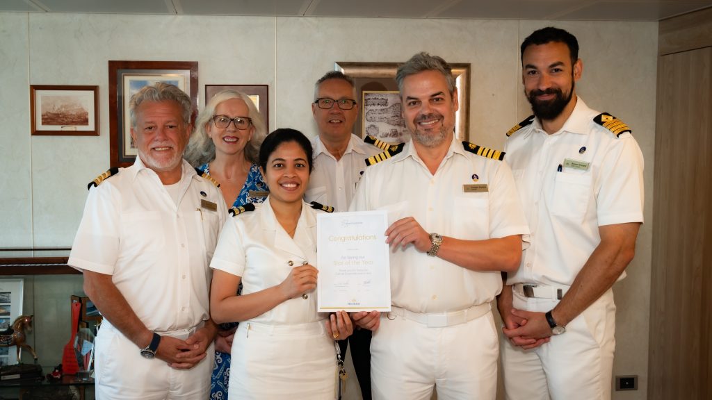We recognise our shining stars on board at the monthly SHINE Awards – where our Culture Essential and SHINE winners are announced and receive £200, a certificate signed by the Captain, a pin to wear and a photo of the occasion. There is also the opportunity for a SHINE Awards team winner of the month too!