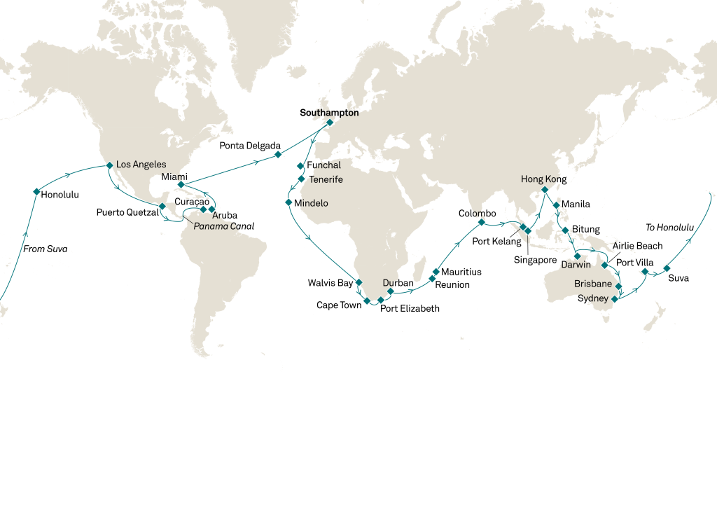 Southampton – Madeira – Tenerife – Mindelo (Cape Verde) – Walvis Bay – Cape Town – Port Elizabeth – Durban – Reunion – Port Louis – Colombo – Port Kelang – Singapore – Hong Kong – Manila – Bitung – Darwin – Airlie Beach – Brisbane – Sydney – Port Villa – Suva – Honolulu – Los Angeles – Puerto Quetzal – Panama Canal (Full Transit) – Curacao – Oranjestad – Miami – Ponta Delgada – Southampton